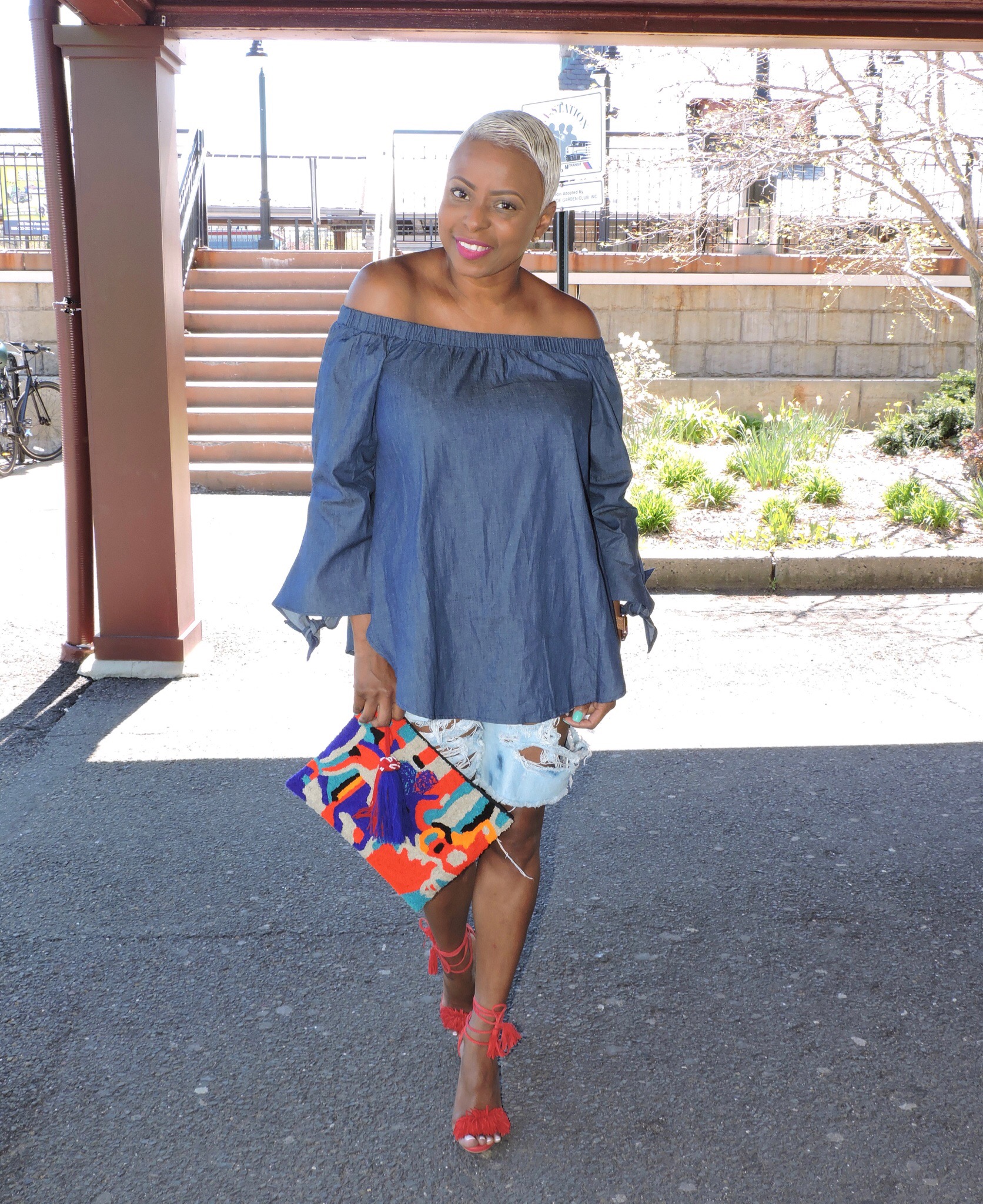 Off the shoulder top || Denim Shorts || Sandals || Clutch: Berry (Sold Out)