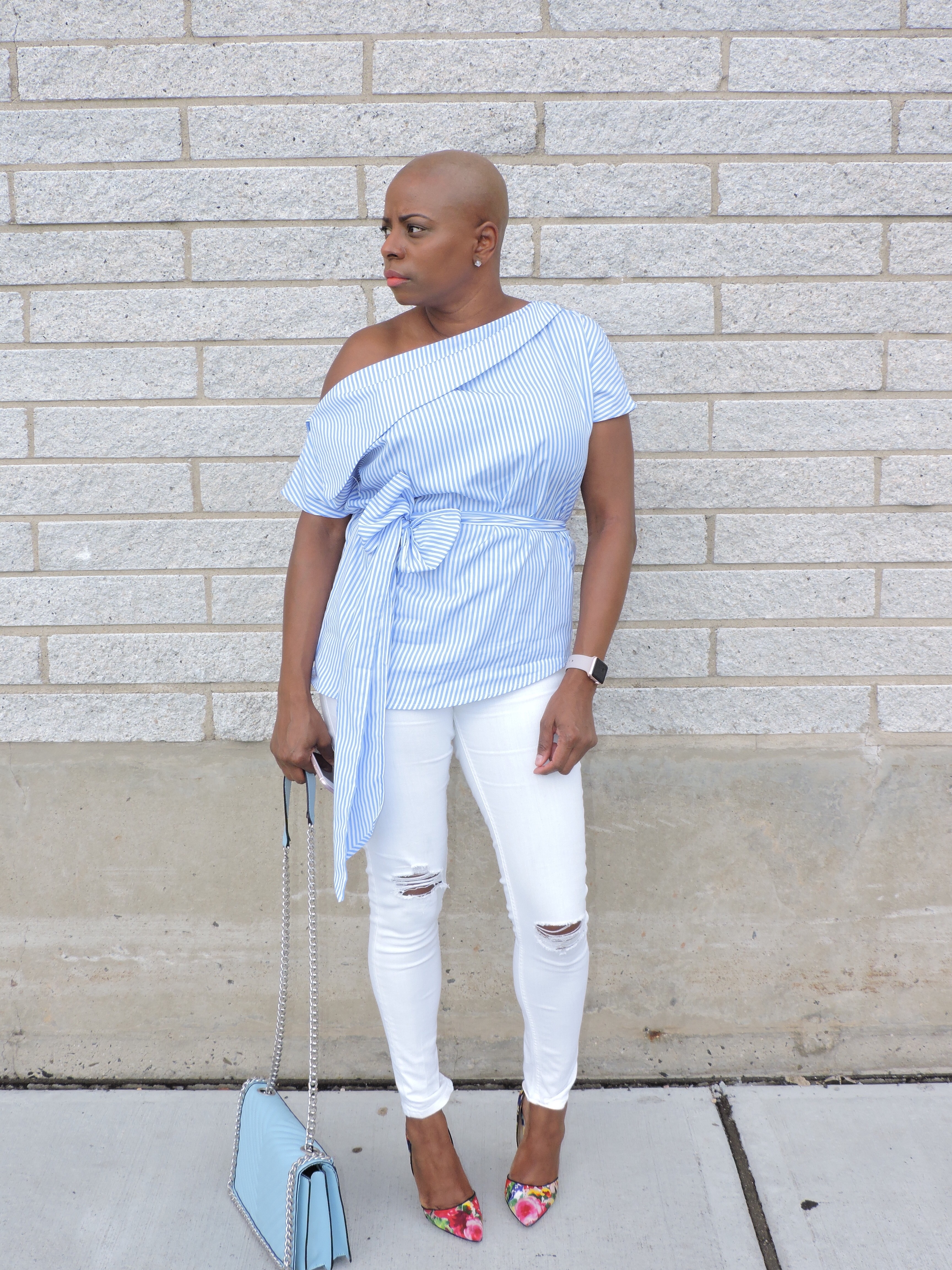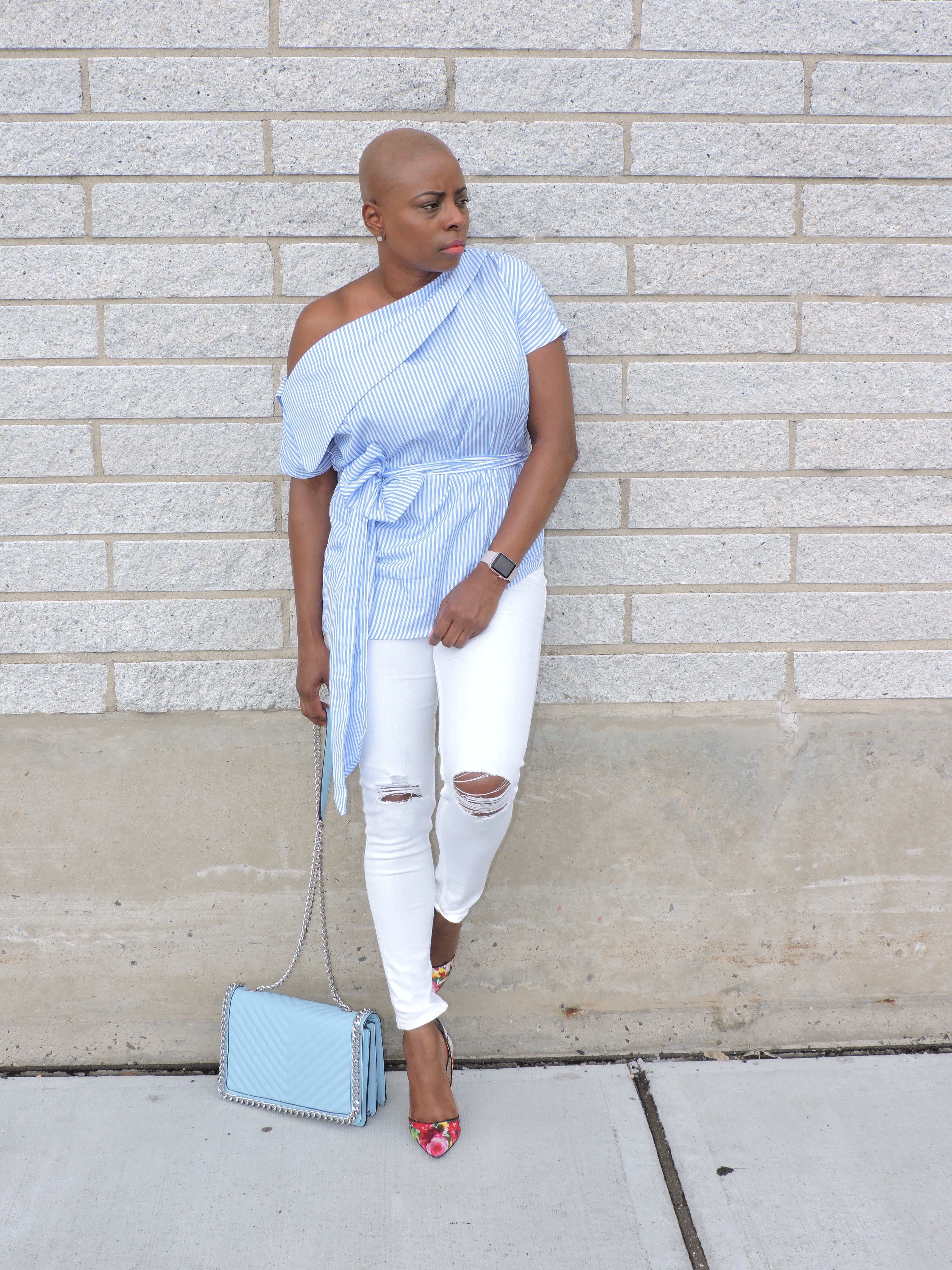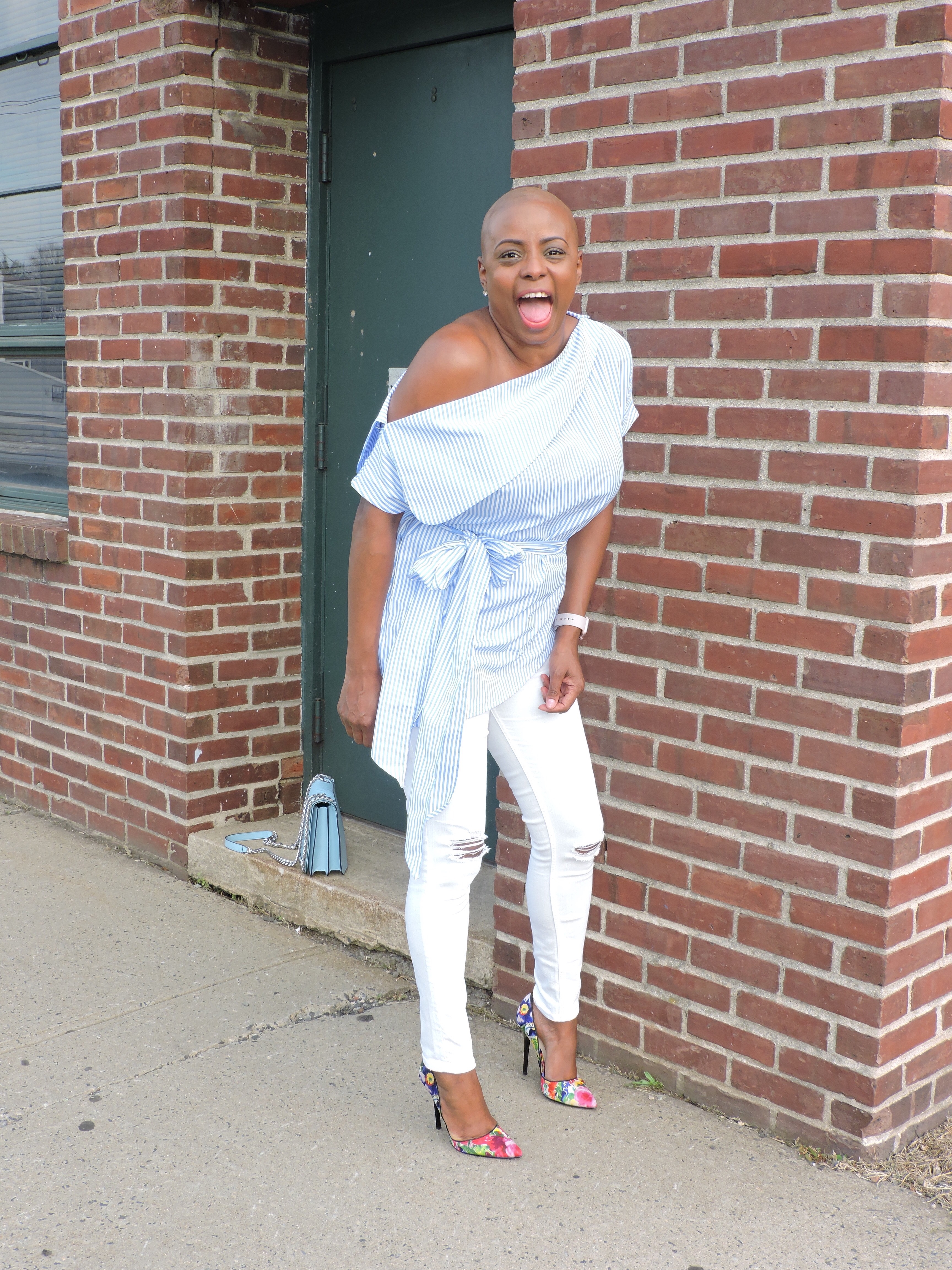 Striped blouse || White Skinny Jeans (Similar) || Floral Pumps (Sold Out) || Chain Link Bag